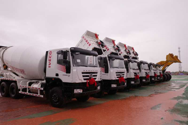 ▲開工儀式現(xiàn)場紅巖瑞江攪拌車列陣待發(fā)