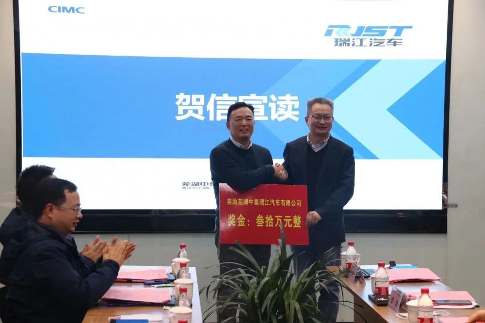 黃維群書記代表區(qū)委向中集瑞江頒發(fā)30萬元獎勵